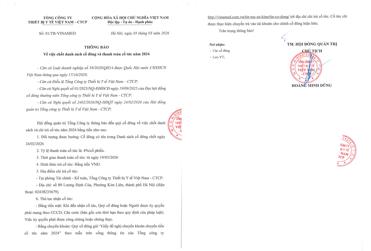 Thông báo về việc chốt danh sách cổ đông và thanh toán cổ tức năm 2024 05/03/2026 admin Link tải tài liệu: Thông báo chốt danh sách và thanh toán cổ tức 2024 Giấy đề nghị chi trả cổ tức năm 2024 bằng chuyển khoản BÀI VIẾT CÙNG CHUYÊN MỤC Thông báo thực hiện khuyến mại “Tăng chậu ngâm khi mua dung dịch xử lý dụng cụ “ Th4 05, 2025 admin Thông báo: Về việc chốt danh sách cổ đông và thanh toán cổ tức 2019 Th9 16, 2020 Vinamed Thông báo về việc chốt danh sách cổ đông tham dự ĐHĐCĐ 2019 Th5 28, 2019 Vinamed